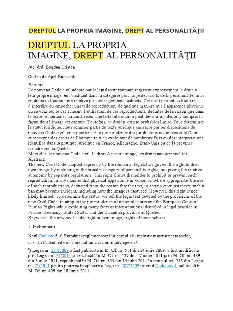 Dreptul La Propria Imagine Drept Al Personalității Secolul Douășiunu