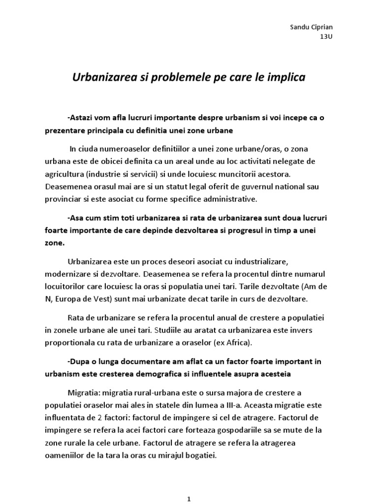 Urbanizarea Si Problemele Pe Care Le Implica