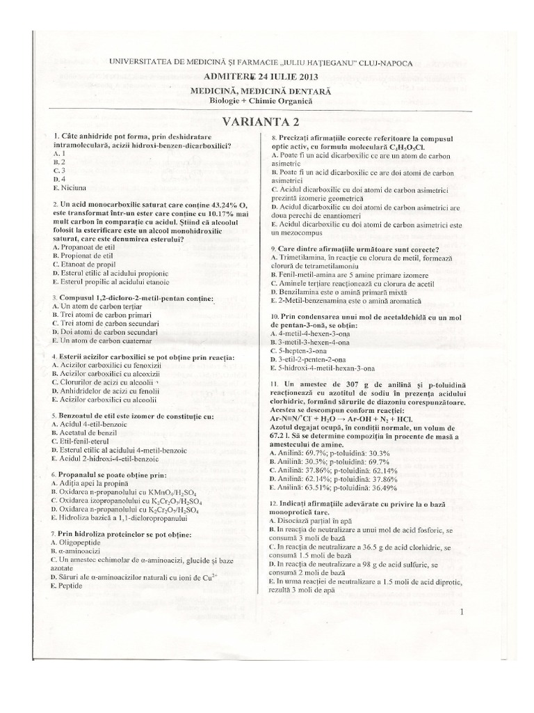 Subiecte Admitere Medicina Cluj 2013